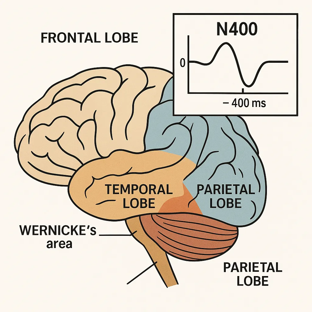 The brain produces an electrical spike called the N400 when seeing unfamiliar words.
