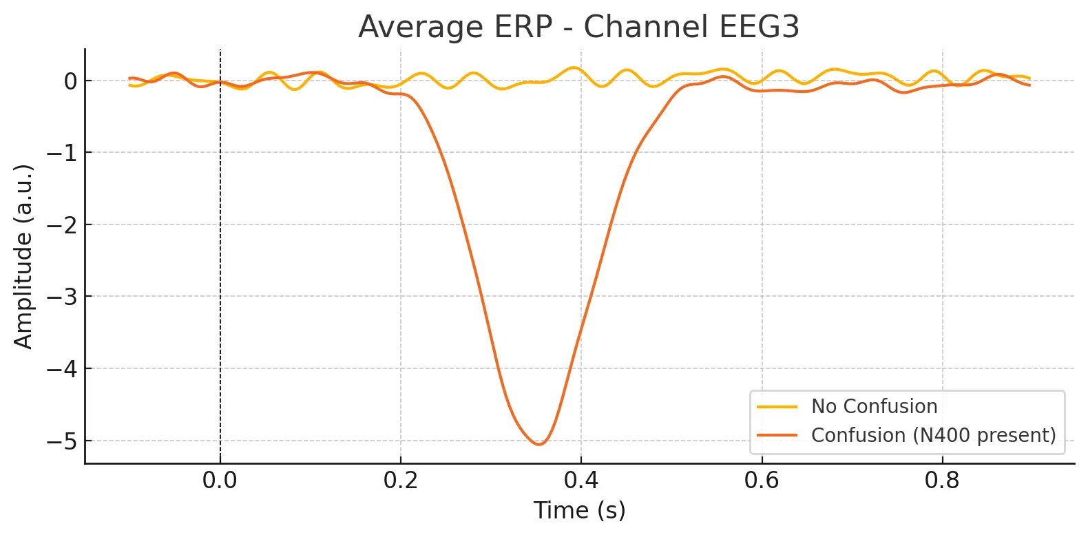 The orange line represents confusion trials, showing the distinct N400 dip our algorithm detects.